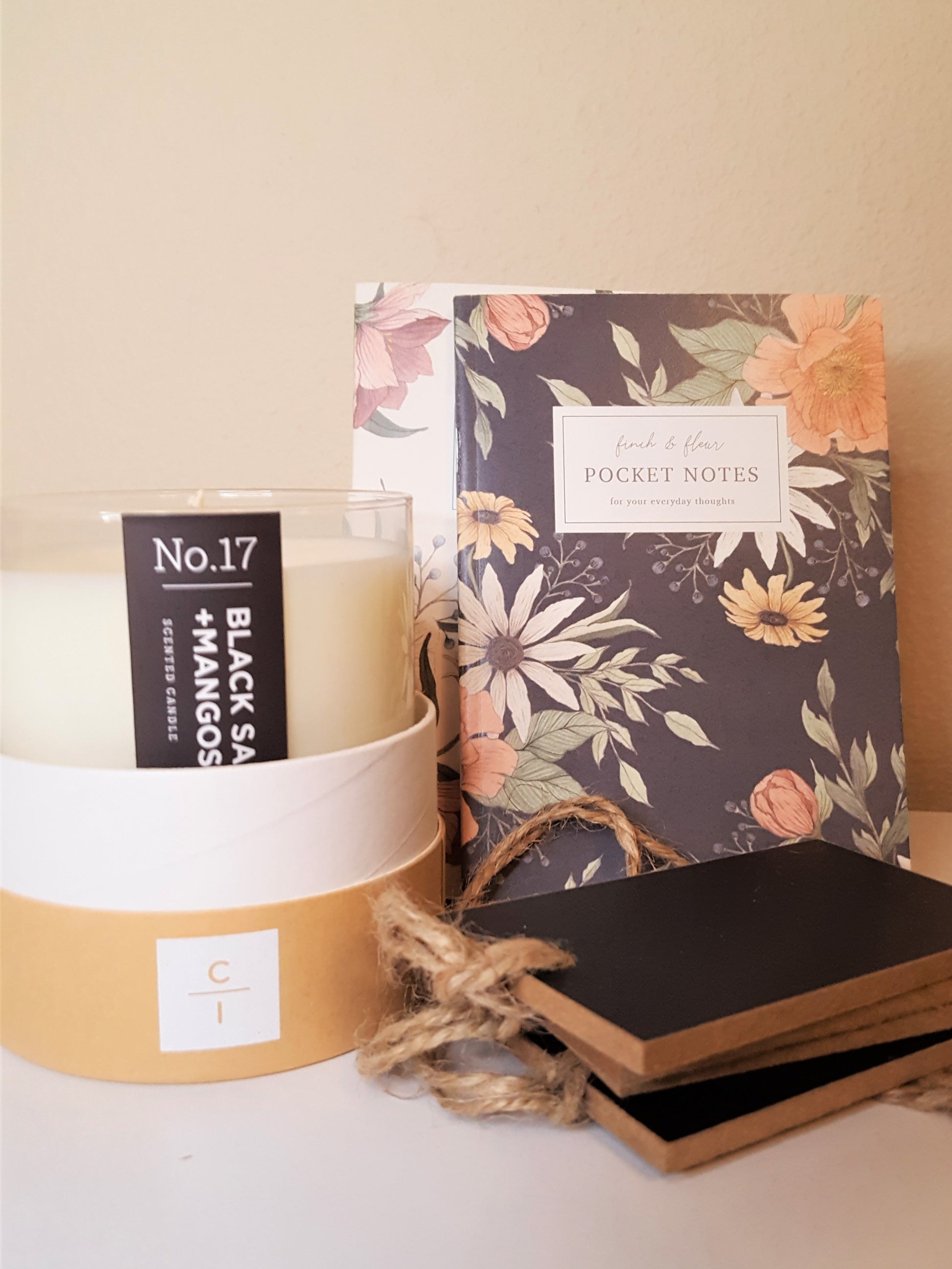 Our Intention Collection is filled with hand picked quality products to celebrate your growth. Each collection includes two pocket notebooks, the Suite Stitch Journal Prompts, a set of chalkboard tags, and a candle hand poured into a glass that can be repurposed as a cocktail glass.